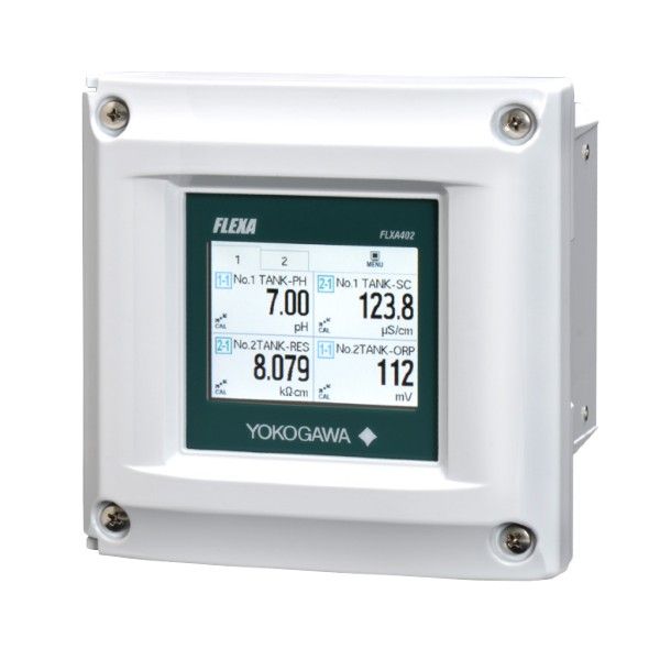 Yokogawa FLXA402 is a modular 4-wire converter for conductivity measurement, equipped with AC power supply, aluminum housing, dual 4–20 mA outputs with HART, relay functions, and universal mounting hardware.